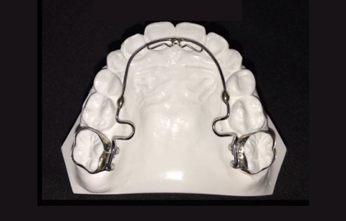 手間の乳臼歯は、根が溶けて吸収しているので、早く抜けてしまう事が多いです。そのような場合、せっかく良い位置に移動させた6歳臼歯が、再び手間に倒れてきてしまうので、保隙装置を装着する必要があります。