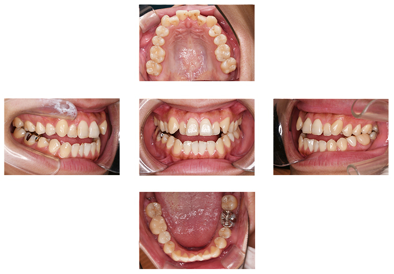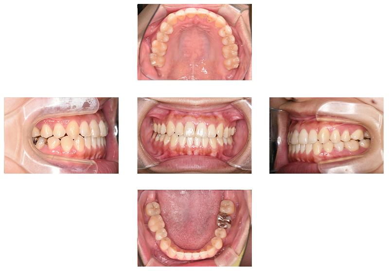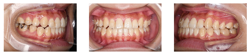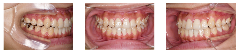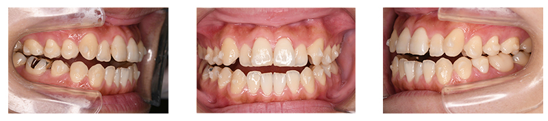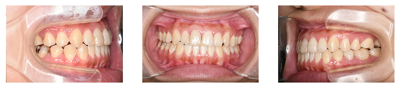 噛み合わせを主訴に来院された患者様です。顎の大きさに対し歯が大きめであったため、上下左右第一小臼歯を抜歯して治療を行っています。上顎にはリンガルアーチを使用し、犬歯を裏側から牽引しています。そのため表側のワイヤーの装置の装着期間が必要最低限となります。